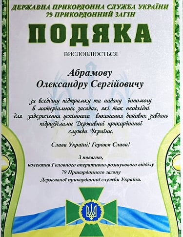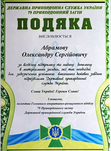 In August 2023, I received an appreciation certificate from the Border Service of Ukraine for comprehensive support and assistance in providing essential resources, crucial for the successful execution of operational tasks by units of the State Border Guard Service of Ukraine.